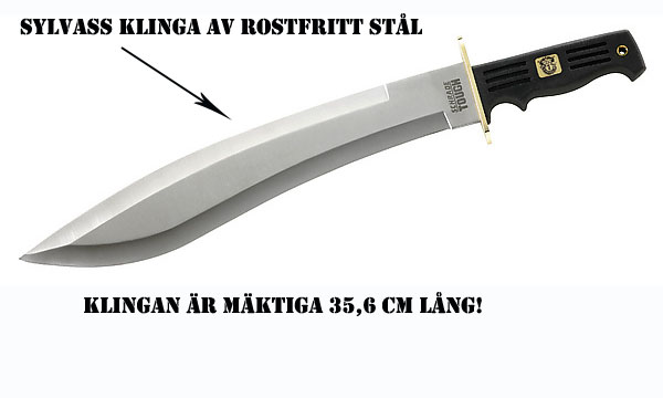 Schrade machete - mäktig & kraftfull! Klingan är mäktiga 36cm lång och är gjord av 420C härdat rostfritt stål och är sylvass. Kraftfulla parerstänger skyddar din hand och fingrar på machetasen. Handtaget till macheten är av gummi och ger ett perfekt grepp. Till macheten medföljer en tjock slida av äkta läder. Tekniska data: Åldergräns för köp är 18år. Ålderskontroll